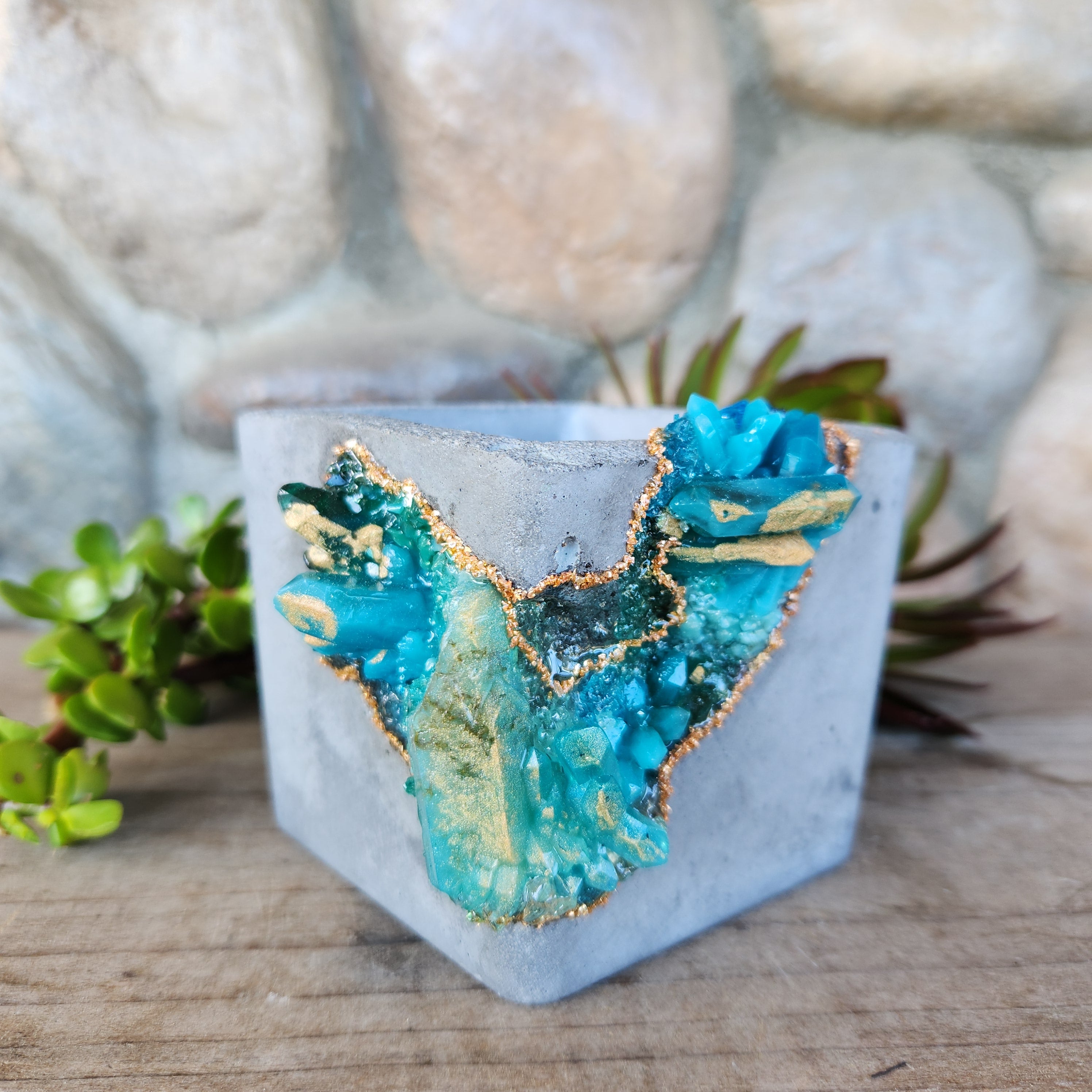 All crystals are woman-made out of epoxy resin and various coloring and sparkles. The geode portion is crushed glass and epoxy and while I've tried to make sure all sharp pieces are covered, please handle with care! The pot is concrete and includes a drainage hole.